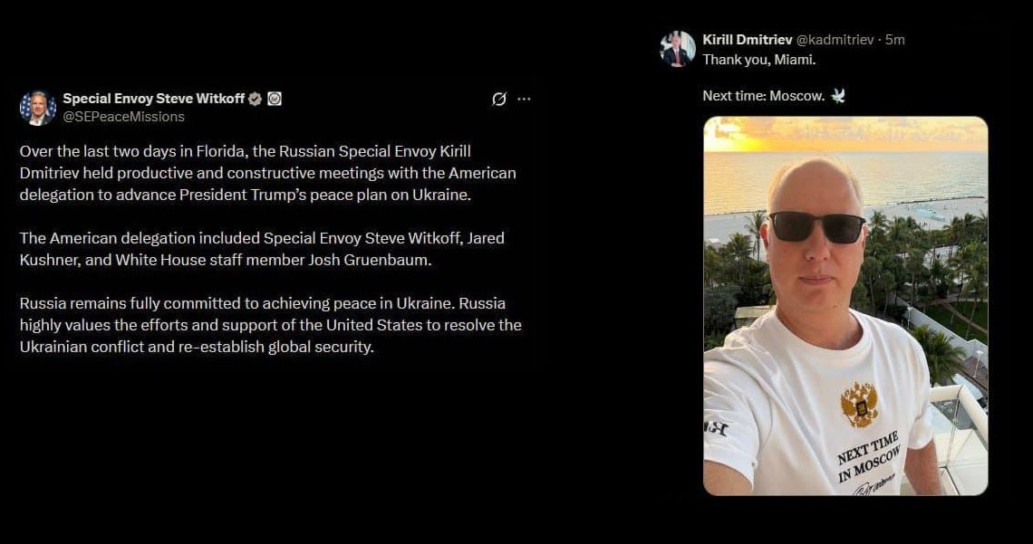 Специјалниот пратеник Стив Виткоф потврди дека рускиот пратеник Кирил Дмитриев имал „продуктивни и конструктивни“ состаноци во Флорида со американската делегација, во која бил и Џаред Кушнер, за да го унапреди мировниот план на претседателот Трамп.