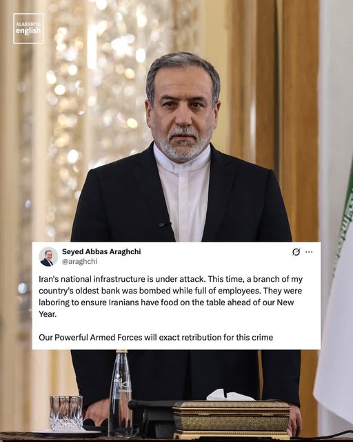 Иранскиот министер за надворешни работи, Абас Арагчи, изјави дека филијалата на најстарата банка во Иран „беше бомбардирана додека беше полна со вработени“, додавајќи дека иранската војска „ќе преземе одмазда за ова злосторство“.