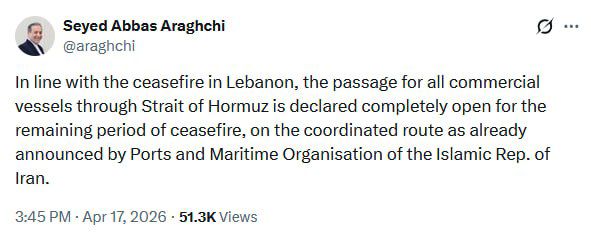 Ормутскиот теснец е отворен – Министерство за надворешни работи на Иран https://t.co/ZyAZLMUYMR